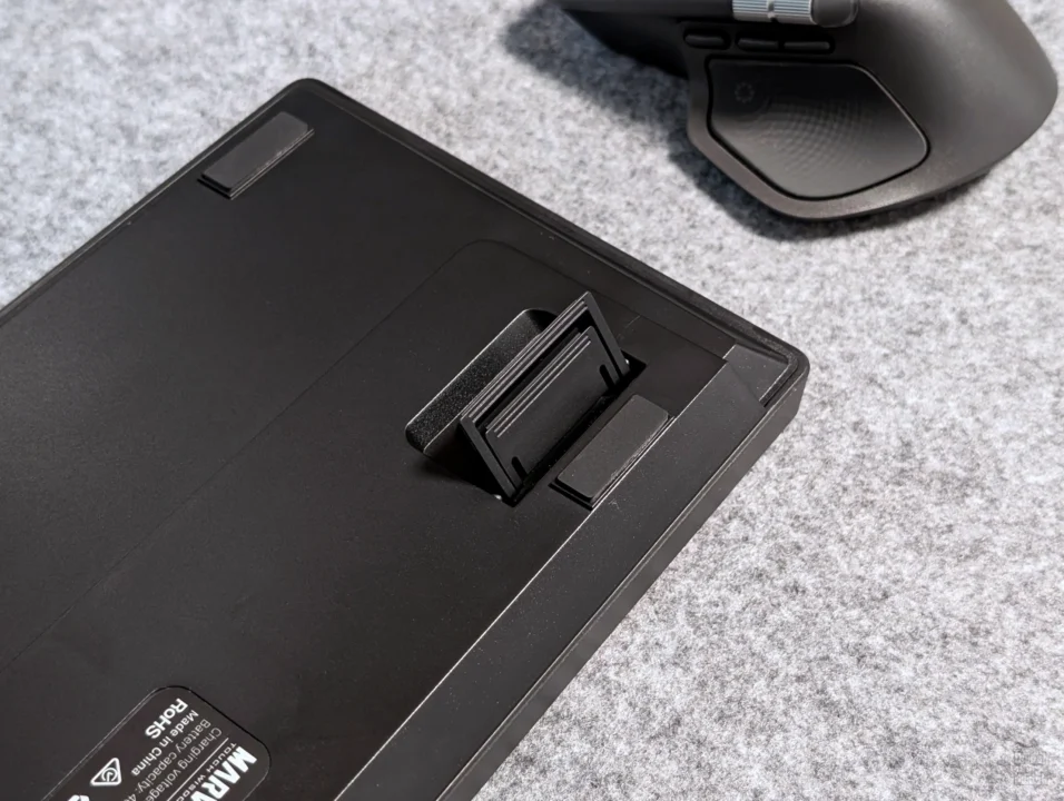 Marvo Meqa 80W jest już fabrycznie lekko nachylona, co jest niezwykle fajne, bo raz, że nie lubię klawiatur leżących na płasko (nazwijmy to, równolegle do powierzchni biurka), a dwa, zawsze brakuje mi tej pozycji „zero”, czyli takiego minimalnego pochylenia zanim skorzystamy z nóżek (tak, wiem jak to zabrzmiało, ale to nie ten film). Tutaj mamy tzw. nóżki podwójne (przed chwilą to sam wymyśliłem), więc nachylenie klawiatury możemy ustawić na dwóch poziomach. Bardziej i jeszcze bardziej czy jakoś tak.