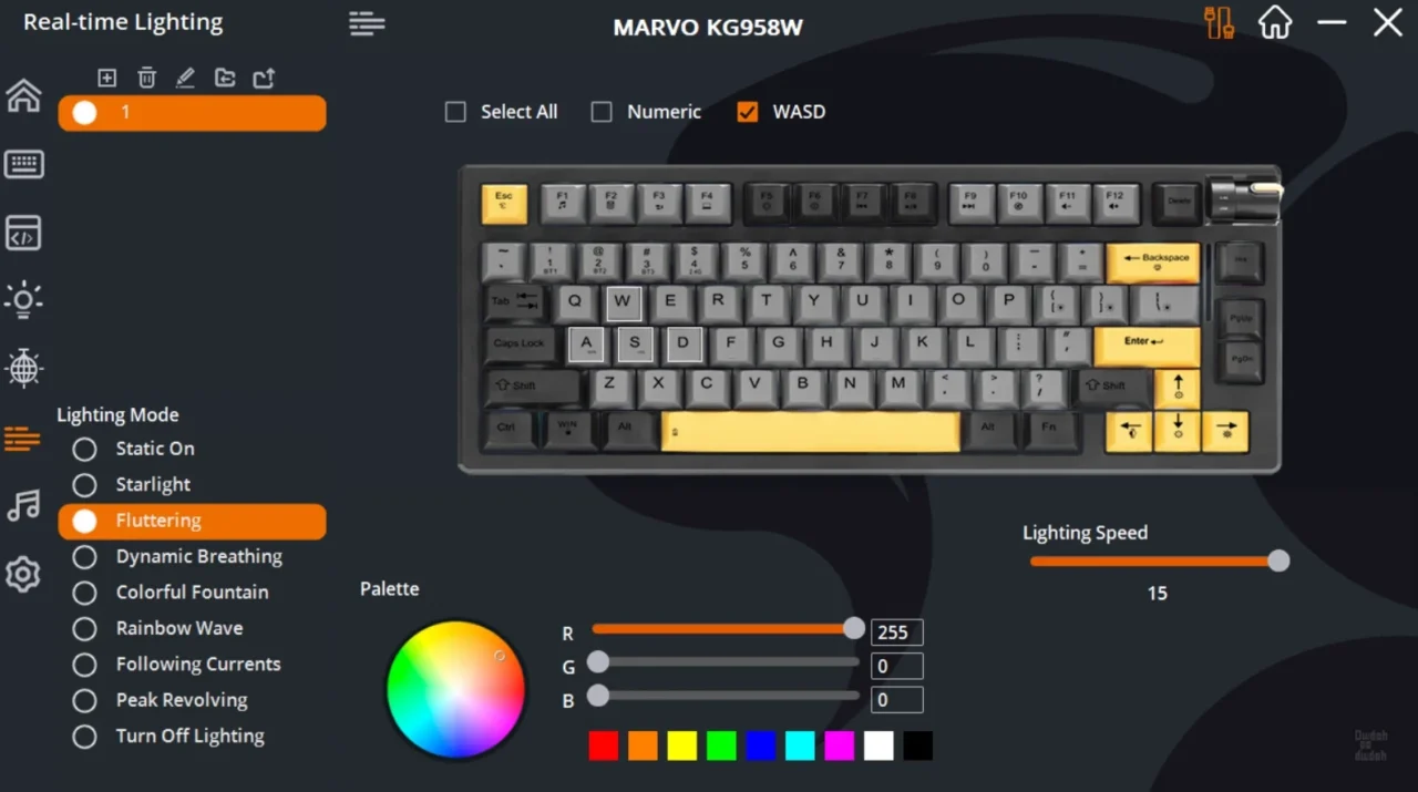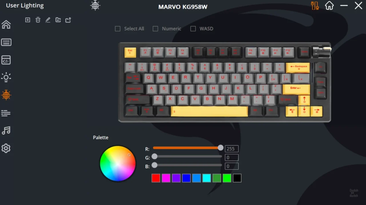 Ponownie mógłbym pojechać oklepanym już powiedzeniem, że nie ma klawiatury gamingowej bez RGB. I cóż, w przypadku Marvo Meqa 80W nie jest inaczej. Klawiatura ma podświetlane wszystkie klawisze i dodatkowo ma też pionowy ledowy pasek po prawej stronie, w szczelinie między Backspace, a Insert. Tak samo jak wszystkie klawisze, pasek ma kilka efektów podświetlenia, ale gdyby ktoś się zastanawiał, czy można go wyłączyć, to od razu odpowiadam – Tak, można. Można z tej klawiatury zrobić „nie-gamingową-bardziej-biurową” klawiaturę, czyli pozbyć się całkiem wszystkich świecidełek.