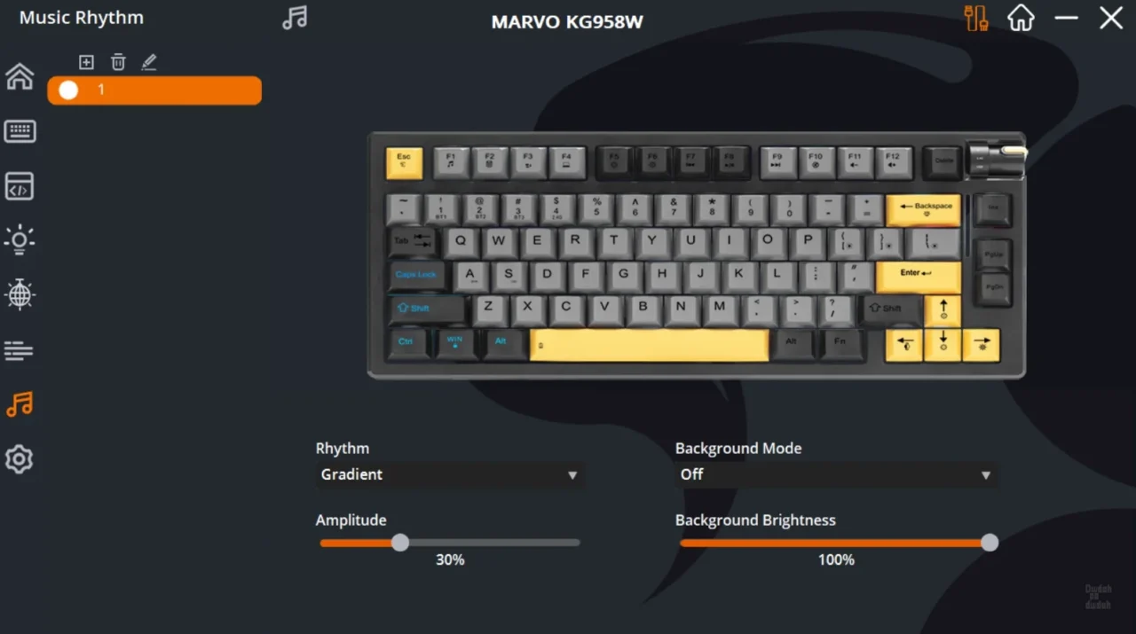 Jeśli jednak zostaniemy przy „choince”, to trochę nam zejdzie zanim przejrzymy wszystkie opcje podświetlenia. Efektów jest naprawdę sporo, szybkich, wolnych, pulsacyjnych, zanikających czy takich, gdzie podświetlają się tylko wybrane klawisze. Mamy pre-definiowane ustawienia, ale nic nie stoi na przeszkodzie, by stworzyć swój profil podświetlenia i podświetlić konkretne klawisze na kolory jakie sobie wybierzemy. Z pewnością każdy wybierze coś pod siebie, pod swój pokój czy podświetlenie innych sprzętów. Mało tego. Klawiatura może podświetlać się też w rytmie odtwarzanej muzyki. Leci coś sobie na Spotify, a klawisze wyglądają jak paski equalizera w jakiejś starej wieży. Tutaj też mamy kilka efektów, łącznie z amplitudą i jasnością podświetlenia. Przyznam, że z taką funkcją w klawiaturach spotkałem się pierwszy raz.