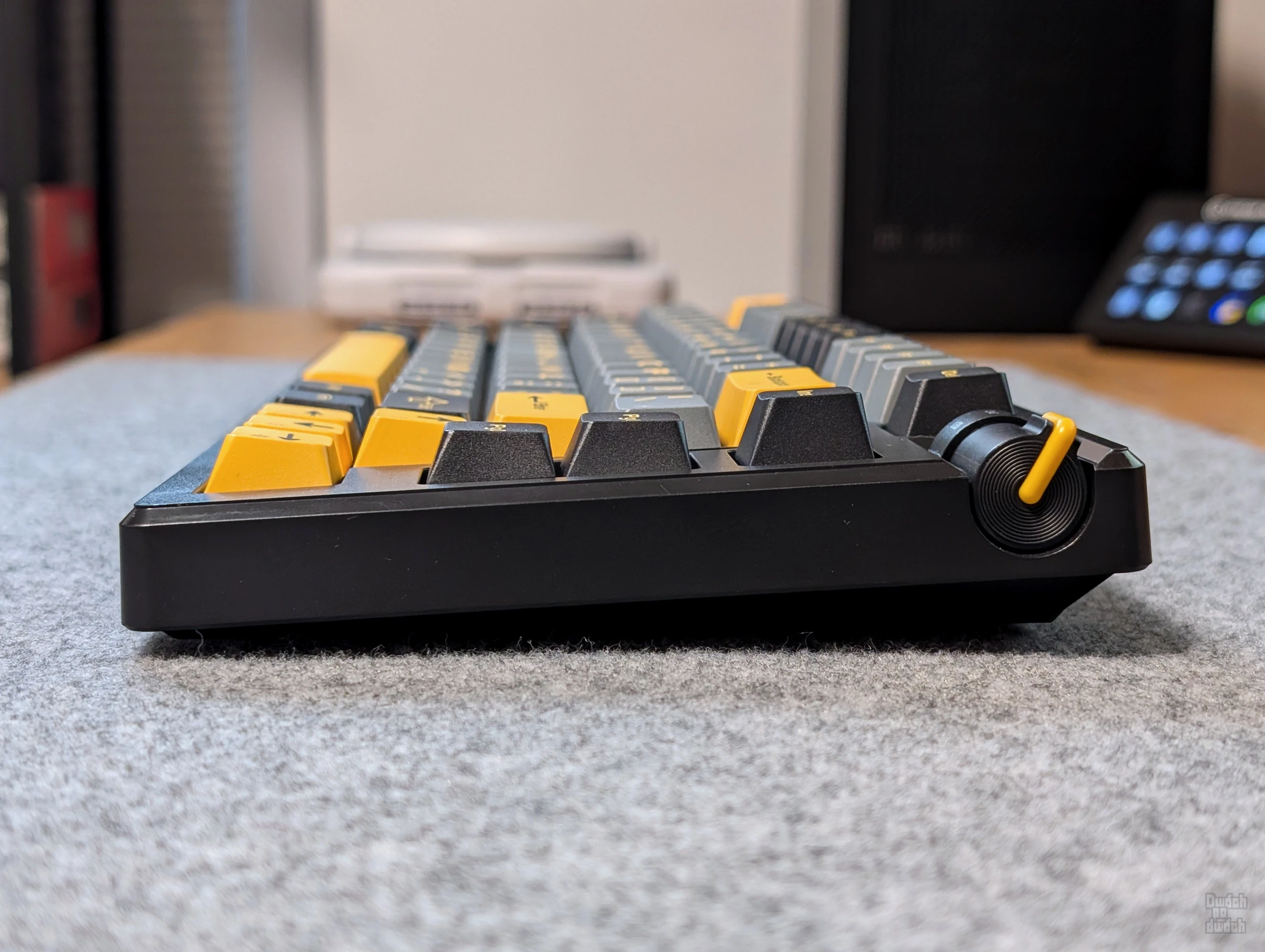 W prawym górnym rogu klawiatury można dostrzec poziomy, walcowaty przełącznik, którym przełączamy tryby pracy klawiatury. A w zasadzie sposób połączenia klawiatury z komputerem. Może to być przez Bluetooth, radiowo z wykorzystaniem odbiornika (którego można chować w klawiaturze, co jest super!) lub przewodowo na USB. I o ile trzy tryby pracy to już pewnego rodzaju standard, tak przełącznik w takiej formie i do takiej funkcji nie jest trafnym rozwiązaniem. Mógłby to być po prostu zwykły przycisk albo mniejszy, jakiś normalniejszy przełącznik, a w tym miejscu widziałbym bardziej pokrętło np. do głośności (coś takiego jak w testowanej kiedyś klawiaturze Glorious GMMK 3 HE) A jeszcze lepiej jakby to pokrętło było programowalne z poziomu aplikacji (o której będzie, ale nieco niżej, spokojnie).